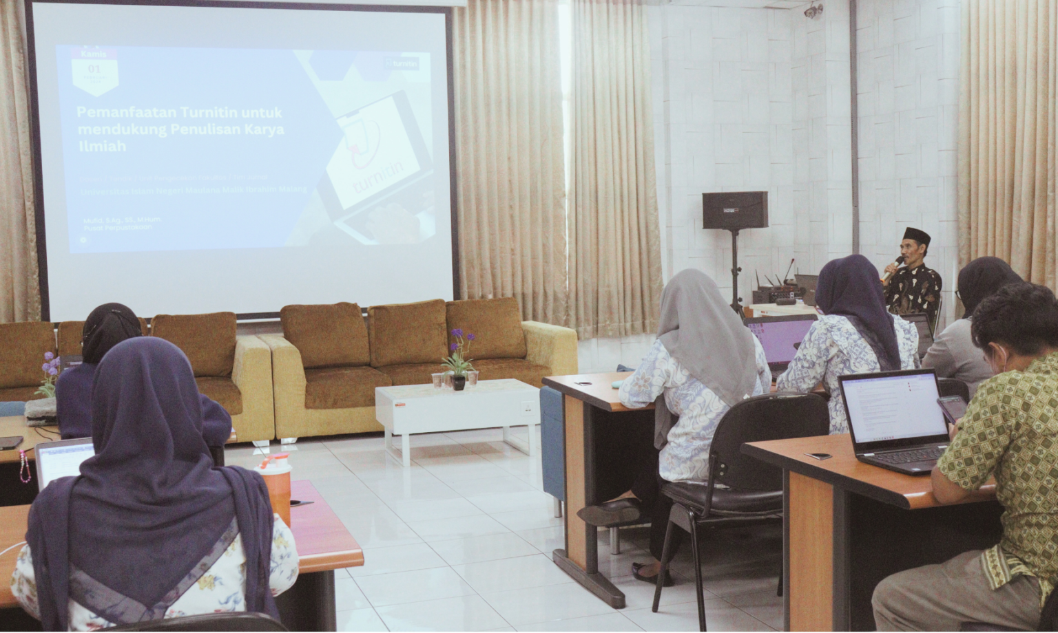 Kamis, 01 Februari 2024. Pusat Perpustakaan UIN Maulana Malik Ibrahim Malang menyelenggarakan pelatihan Pemanfaatan Turnitin untuk Mendukung Penulisan Karya Ilmiah bagi dosen, tenaga kependidikan, staf pengecekan fakultas dan tim jurnal. Kegiatan ini disampaikan oleh Kepala Pusat Perpustakaan, Bapak Mufid, M. Hum. di ruang literasi informasi lantai 1 Pusat Perpustakaan dan dihadiri oleh 35 peserta instructor civitas akademika. Memulai acara beliau memberi pendahuluan dengan menyampaikan bahwa pada tahun 2023, UIN Maulana Malik Ibrahim Malang merupakan Institusi dengan penggunaan Turnitin tertinggi nomor 1 di Indonesia. Dalam penyampaian materi beliau menyampaikan terkait langkah-langkah pengajuan akun Turnitin, tahapan penggunaan akun instructor, dan membuat Class dan Assignment untuk tujuan pembelajaran/ Individu/ Unit Cek Plagiasi Fakultas/ Jurnal. Kegiatan ini tidak hanya berupa materi, namun peserta dapat secara langsung praktik membuat akun dan menggunakan Turnitin yang didampingi oleh tim tenaga ahli perpustakaan. Kegiatan cukup interaktif, melihat dari berbagai pertanyaan yang diajukan kepada pemateri. (Heni KN)