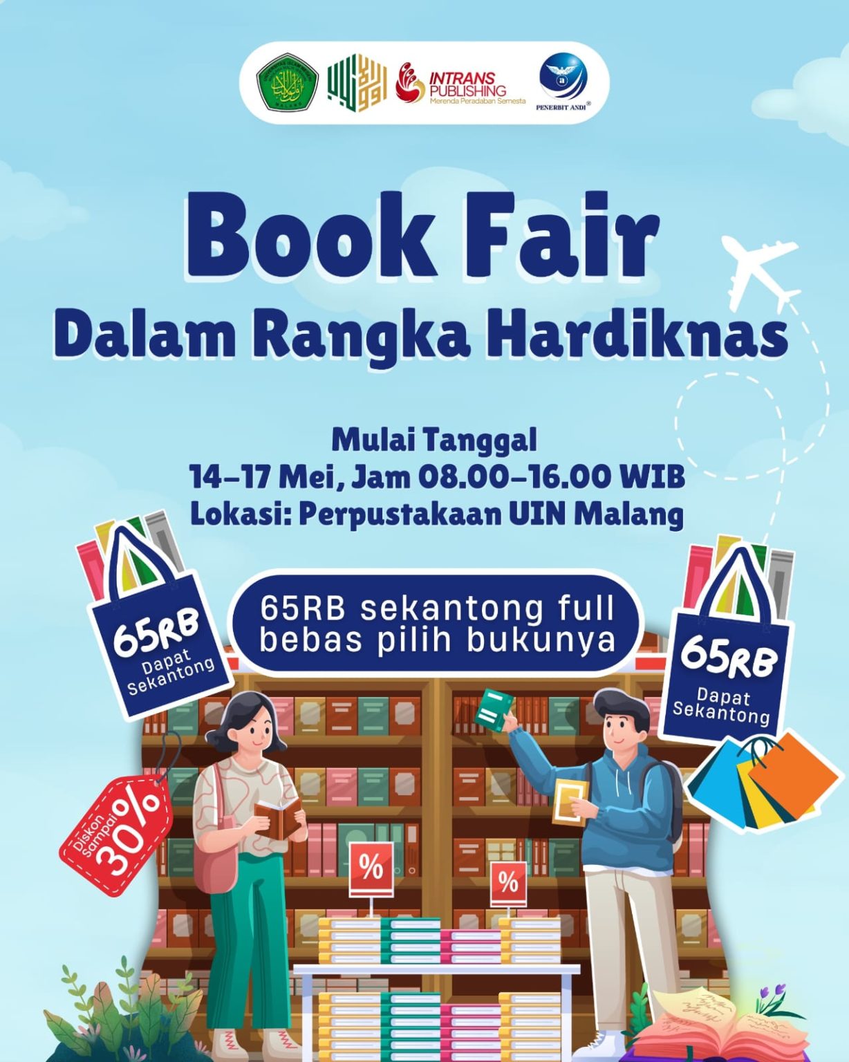 Share Facebook Twitter LinkedIn Email Telegram WhatsApp Halo Civitas Akademika UIN Malang, Yuk kunjungi Book Fair, Kapan lagi nih bisa beli buku 65.000,- aja dapetnya sekantong full? Markibu, Mari Kita Serbuuuuuuu book fair hardiknas