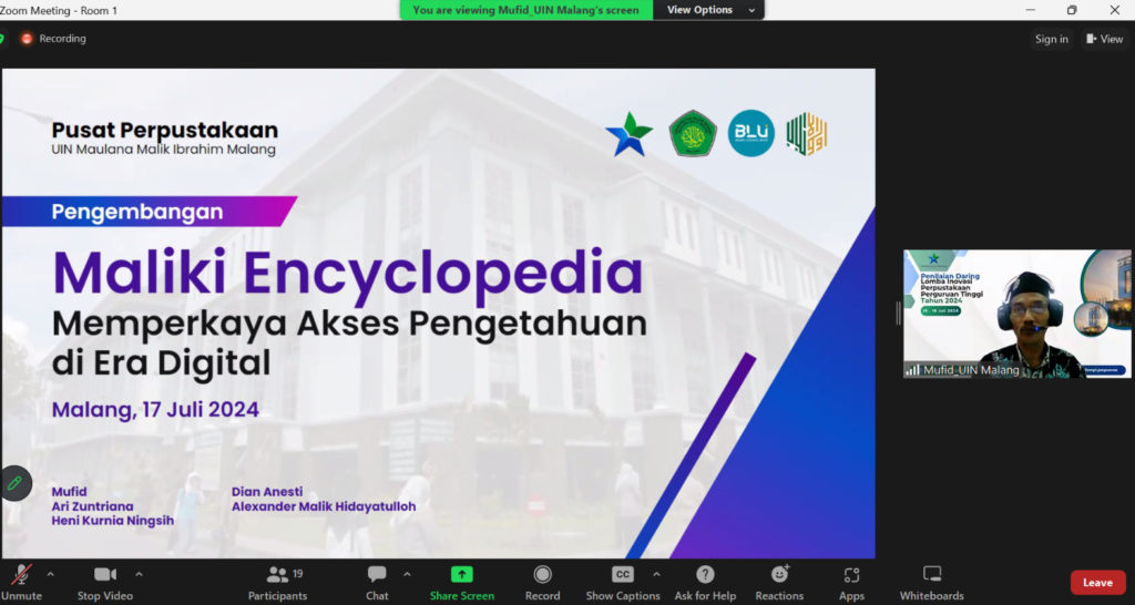 Rabu, 17 Juli 2024. Pusat Perpustakaan UIN Maulana Malik Ibrahim Malang menjalani penilaian lomba inovasi perpustakaan perguruan tinggi yang diselenggarakan oleh Perpustakaan Nasional Republik Indonesia melalui Pusat Pengembangan Perpustakaan Sekolah/Madrasah dan Perguruan Tinggi. Kegiatan ini berlangsung kurang lebih selama 1 (satu) jam dan terlaksana secara daring. Kegiatan ini dihadiri oleh Wakil Rektor bidang Akademik UIN Malang, Kepala Pusat Perpustakaan UIN Malang beserta tim pengembangan inovasi Perpustakaan, dan Tim Juri. Acara diawali dengan pembukaan oleh moderator Ibu Maria Roshita, sekaligus pembacaan tata tertib selama penilaian berlangsung. Kegiatan dilanjutkan dengan sambutan oleh Wakil Rektor bidang Akademik, Ibu Prof. Dr. Umi Sumbulah, M. Ag, yang menyampaikan rasa terimakasih dan apresiasi atas terpilihnya Inovasi Pusat Perpustakaan UIN Malang dalam penetapan 20 peserta terbaik lomba inovasi perpustakaan perguruan tinggi tahun 2024, beliau menyampaikan saat ini terdapat 4 (empat) capaian Pusat Perpustakaan UIN Malang, diantaranya pertama, Pusat Perpustakaan telah terakreditasi dengan nilai A selama 2 periode,, kedua, Pusat Perpustakaan telah melaksanakan berbagai program peningkatan kompetensi pustakawan dan pengelola perpustakaan baik di dalam negeri maupun di luar negeri, ketiga, Pusat Perpustakaan telah menjalin kemitraan dengan berbagai forum dan asosiasi baik tingkat nasional maupun internasional, dan keempat, Pusat Perpustakaan telah mengembangkan berbagai platform digital, salah satunya yaitu Maliki Encyclopedia yang saat ini menjadi inovasi terbaru dari pengembangan layanan perpustakaan, harapannya, kegiatan dan inovasi lomba ini dapat memotivasi dalam meningkatkan kualitas layanan prima bagi civitas akademika serta mendukung tercapainya visi dan misi universitas, terakhir beliau berharap tim juri dapat memberikan saran dan masukan yang kontruktif bagi pengembangan inovasi,