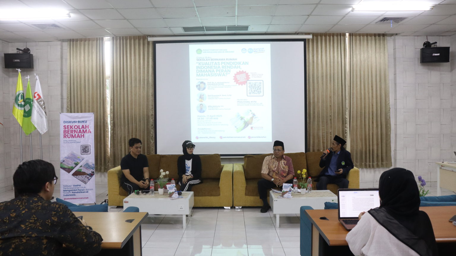 Kamis, 17 April 2025. Pusat Perpustakaan menyelenggarakan diskusi buku “Sekolah Bernama Rumah” dengan tema “Kualitas Pendidikan Indonesia Rendah, Dimana Peran Mahasiswa?”. Pada kesempatan ini, penulis buku, Rifky Mahruly, S.E., Suri Kusuma R. Dewi, S.Pd. dan Guru Besar Ilmu Pendidikan Islam UIN Maulana Malik Ibrahim Malang, Prof. Dr. H. Ahmad Nurul Kawakib, M. Pd., MA hadir menjadi pembicara. Acara yang di moderatori oleh Staf Pusat Publikasi ilmiah, Iffatunnida, M. Pd ini, dihadiri oleh 29 Mahasiswa dari berbagai jurusan. Kepala Pusat Perpustakaan, Bapak Mufid, M. Hum dalam sambutannya menyampaikan rasa terimakasih telah melaksanakan diskusi buku, beliau juga ingin mengetahui latar belakang, serta tips dan trik dalam pengambilan judul buku tersebut, dan harapan beliau buku ini berperan penting untuk mahasiswa dan civitas akademika di UIN MALANG.