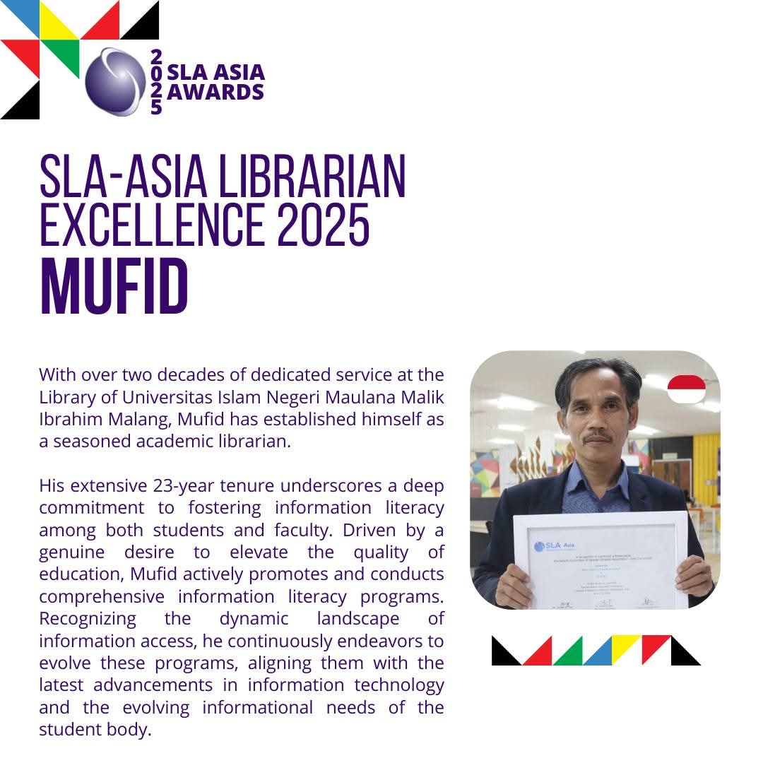 Malang, 28 Mei 2025, Kepala Pusat Perpustakaan UIN Maulana Malik Ibrahim Malang, Bapak Mufid, M. Hum baru saja menerima penghargaan dari SLA (Special Libraries Association). Dengan pengalaman lebih dari dua dekade sebagai pustakawan, beliau terus menunjukkan komitmennya dalam meningkatkan literasi informasi di kalangan civitas akademika.