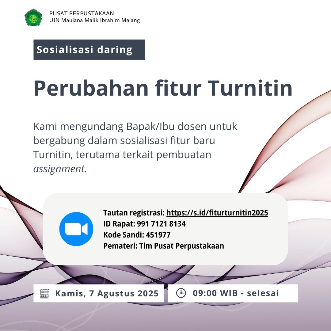 Via Online Video Conference https://telkomsel.zoom.us/j/2393457832?pwd=HEmeL7HPNP8JWgg5xcQ1trkDD8GdBm.1&omn=91776787913, MalangAssalamu’alaikum Wr. Wb. Pusat Perpustakaan UIN Maulana Malik Ibrahim Malang mengundang Bapak/Ibu Dosen untuk menghadiri Sosialisasi Fitur Baru Turnitin. Fitur ini berkaitan dengan pembuatan assignment untuk mahasiswa. Acara sosialisasi insyaAllah akan dilaksanakan pada: 🗓: Kamis, 7 Agustus 2025 🕘: 09.00 WIB – selesai 📍: 991 7121 8134 🔗: https://telkomsel.zoom.us/j/99171218134?pwd=8kpek4adW4aiBqS8OlsN8iCfmYrH5b.1 Registrasi di https://s.id/fiturturnitin2025 Demikian, kami mengucapkan