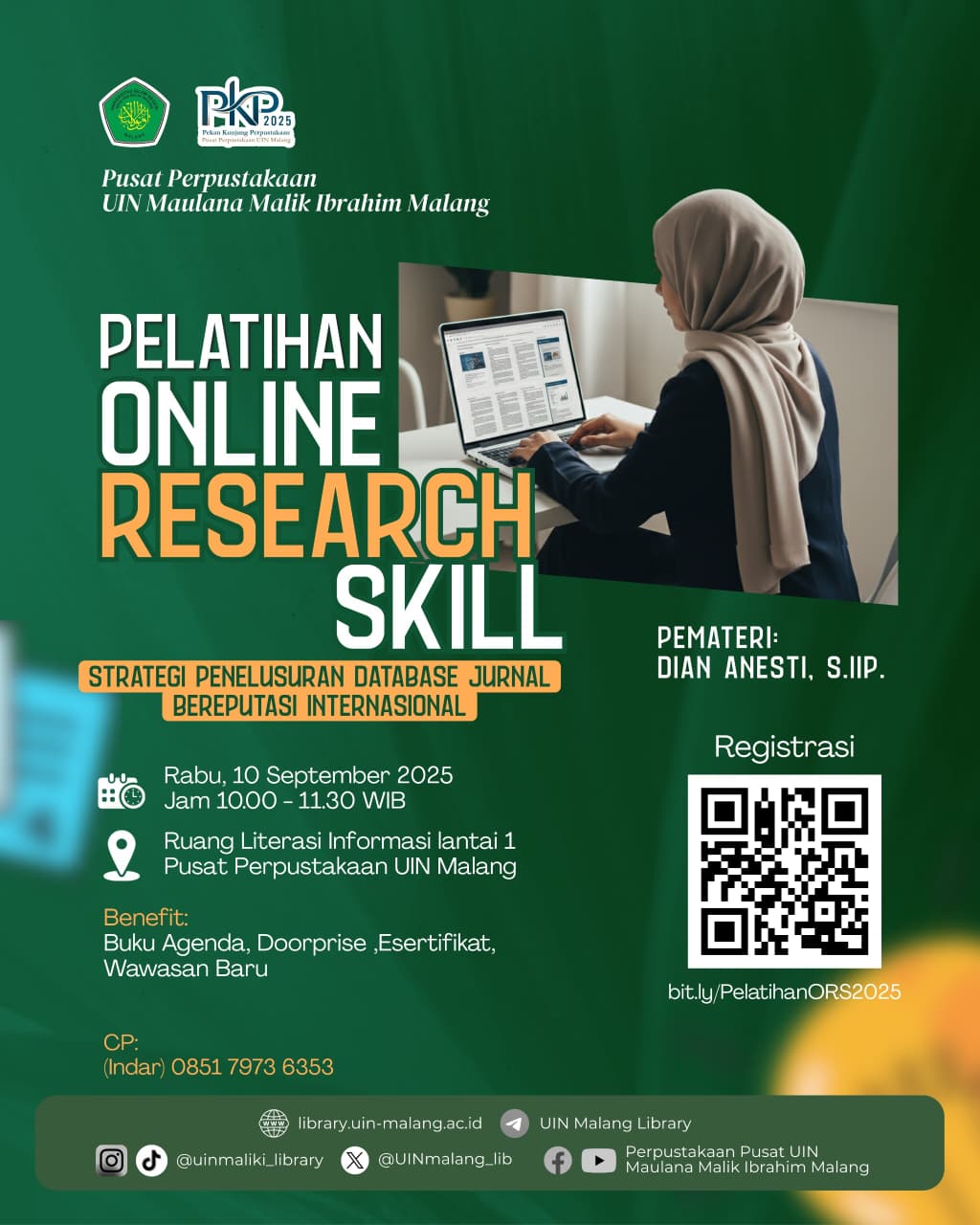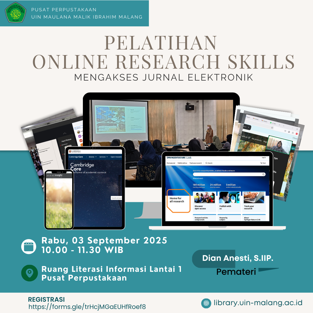 Perpustakaan Pusat Gajayana 50 Malang, Malang📚 Halo #MahasiswaUINMalang! Kalian sering bingung mencari artikel jurnal untuk tugas akhir atau penelitian? 😅 Tenang, Pusat Perpustakaan UIN Malang mengadakan Pelatihan Online Research Skills, lohh !! Bersama Ibu Ari Zuntriana, MA., kalian bakal belajar bagaimana menemukan sumber ilmiah yang kredibel lewat akses jurnal elektronik kampus. 🗓️ Selasa, 11 November 2025 🕘 09.30 – 11.00
