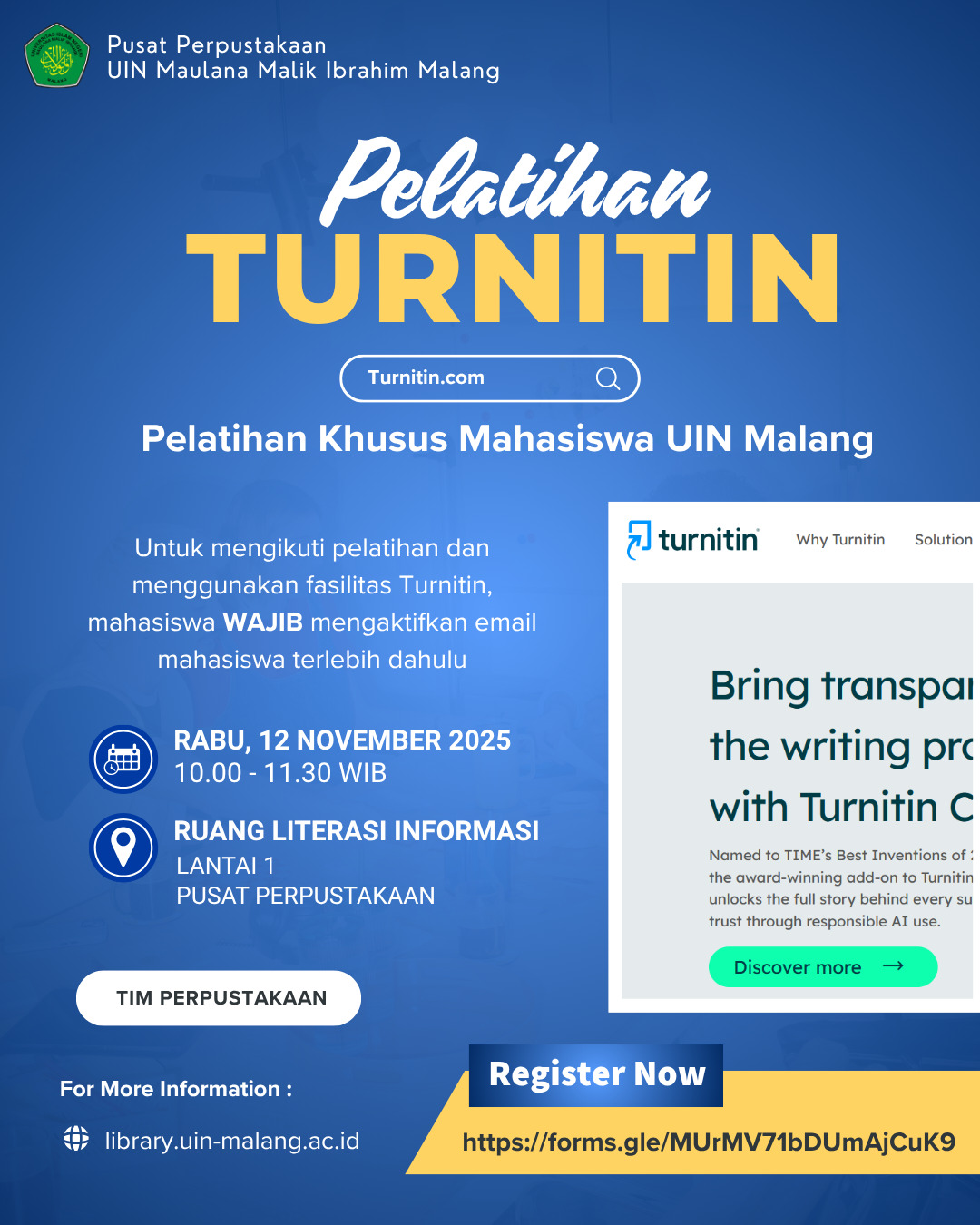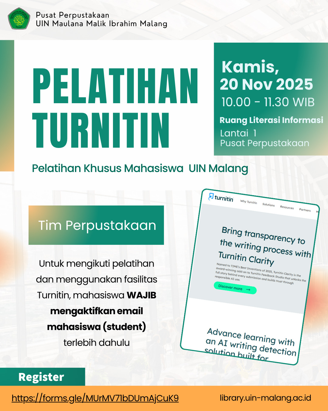 Perpustakaan Pusat Gajayana 50 Malang, MalangAssalammualaikum Wr. Wb. Halo Mahasiswa/i UIN Maulana Malik Ibrahim Malang, ingin tau cara mengajukan akun Turnitin bagi mahasiswa? Lalu bagaimana cara menggunakan dan mengecek karya tulis di Turnitin? Yuk, ikuti Pelatihan Turnitin Bagi Mahasiswa bersama Tim Turnitin Perpustakaan, yang akan dilaksanakan pada: 🗓️ : Kamis, 20 November 2025 🕐 : 10.00 - 11.30 WIB 📍:
