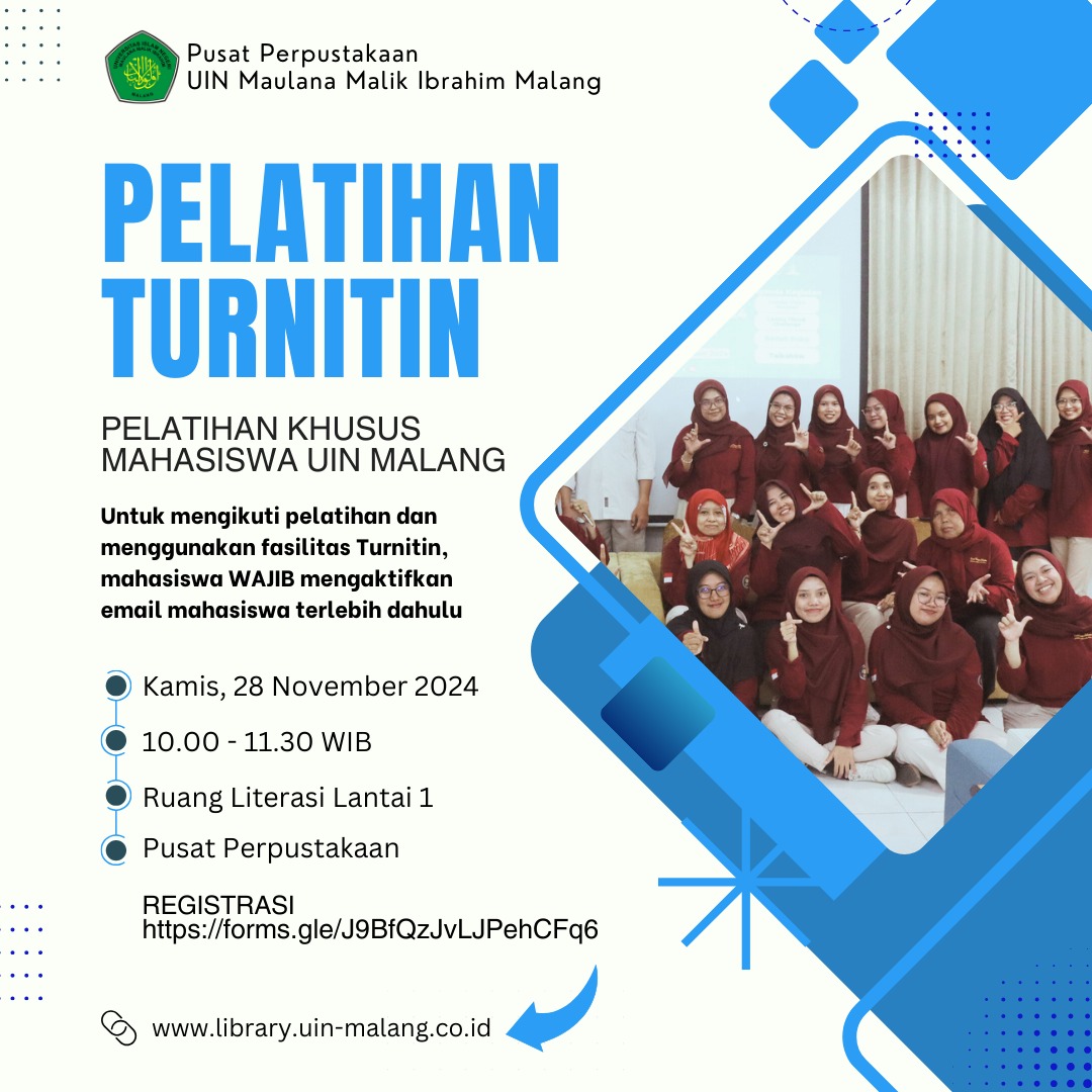 Perpustakaan Pusat Gajayana 50 Malang, MalangPusat Perpustakaan UIN Maulana Malik Ibrahim Malang kembali menyelenggarakan Pelatihan Turnitin bagi Mahasiswa, yang akan dilaksanakan pada: Hari: Kamis, 28 November 2024 Pukul: 10.00-11.30 WIB. Ruang Literasi Informasi lantai 1 Registrasi : https://forms.gle/J9BfQzJvLJPehCFq6 Syarat partisipasi: mahasiswa aktif UIN Maliki Malang & menggunakan Laptop Untuk mengikuti pelatihan dan menggunakan fasilitas Turnitin, mahasiswa wajib mengaktifkan email mahasiswa